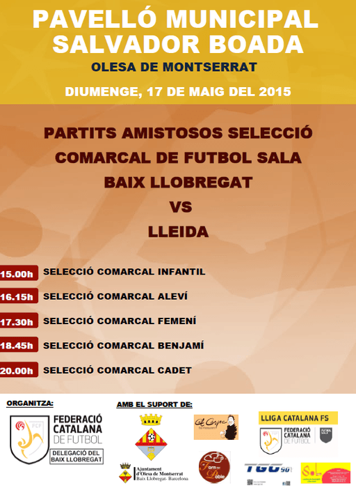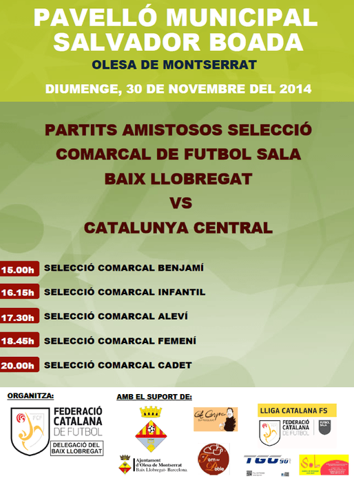 Aquest passat diumenge, 30 de novembre, es van celebrar a Olesa de Montserrat els Partits de Presentació i Preparació de la Selecció Comarcal del Baix Llobregat de Futbol Sala amb la Selecció de la Catalunya Central i del Vallès Occidental, durant tota la tarda es va respirar un molt bon ambient de futbol sala i es va poder gaudir amb el grandíssim nivell dels millors jugadors i jugadores de la nostra comarca. Per a la nostra entitat ha estat un orgull poder acollir aquest esdeveniment i volem felicitar als organitzadors i als seleccionadors per la bona tasca desinteressada que estan fent i també volem felicitar als protagonistes d'aquesta festa, als jugadors de la selecció, entre els quals hi ha 8 olesans. Per últim volem desitjar-vos molta sort en el Campionat Comarcal de Seleccions Base de Futbol Sala 2014-2015 que afrontareu aquest proper cap de setmana!!!