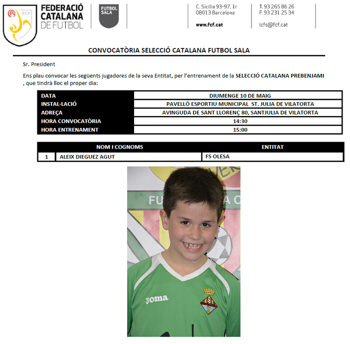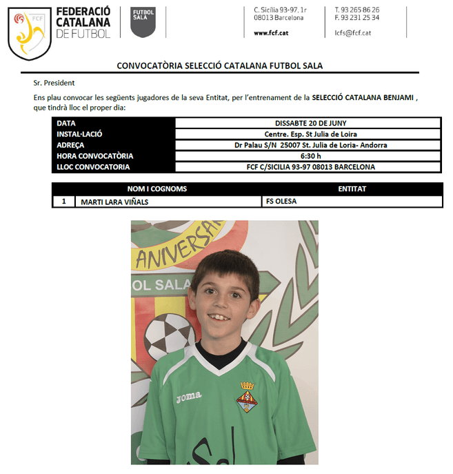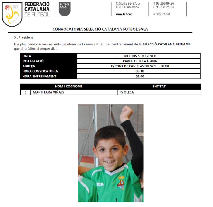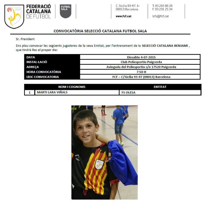 EL NOSTRE JUGADOR MARTÍ LARA PARTICIPARÀ AMB LA SELECCIÓ CATALANA BENJAMÍ AL TORNEIG INTERNACIONAL DE FUTBOL SALA CELEBRAT A PUIGCERDÀ AQUEST DISSABTE!!!