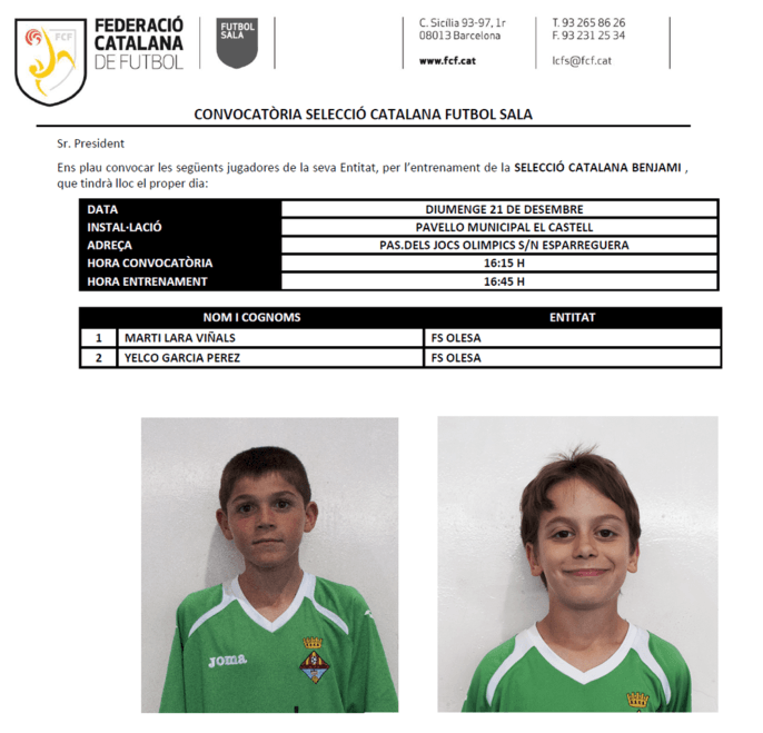 Els jugadors Yelco Garcia i Martí Lara del Benjamí A han estat convocats per la Selecció Catalana de Futbol Sala de categoria Benjamí per a realitzar un entrenament preparatori per futurs campionats.