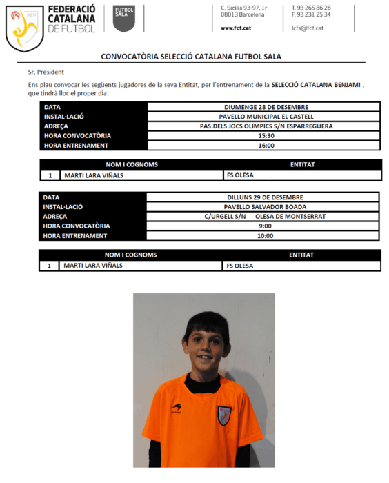 El jugador Martí Lara del Benjamí A segueix convocat per la Selecció Catalana de Futbol Sala de categoria Benjamí al tercer i quart entrenament.
