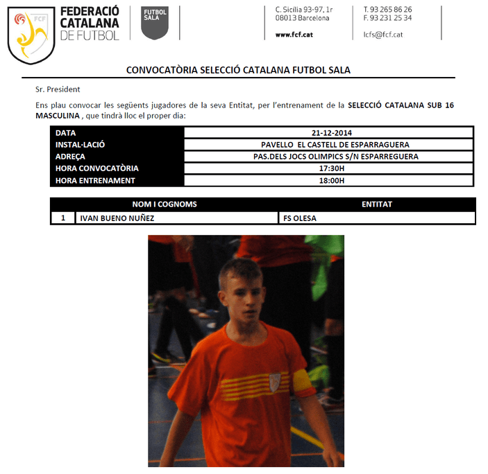 El jugador Ivan Bueno del Cadet A ha estat convocat per la Selecció Catalana de Futbol Sala de categoria Cadet a un entrenament. Després de realitzar una molt bona actuació al Campionat Comarcal i durant el seu dia a dia, sembla que l'esforç pot tenir la seva recompensa.