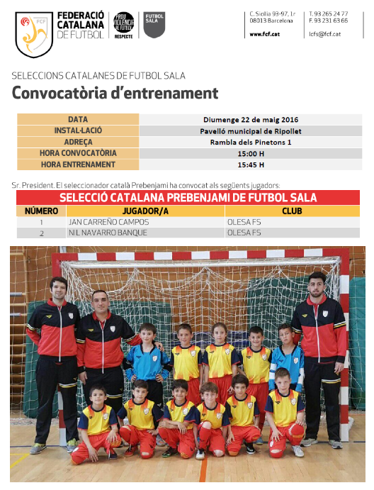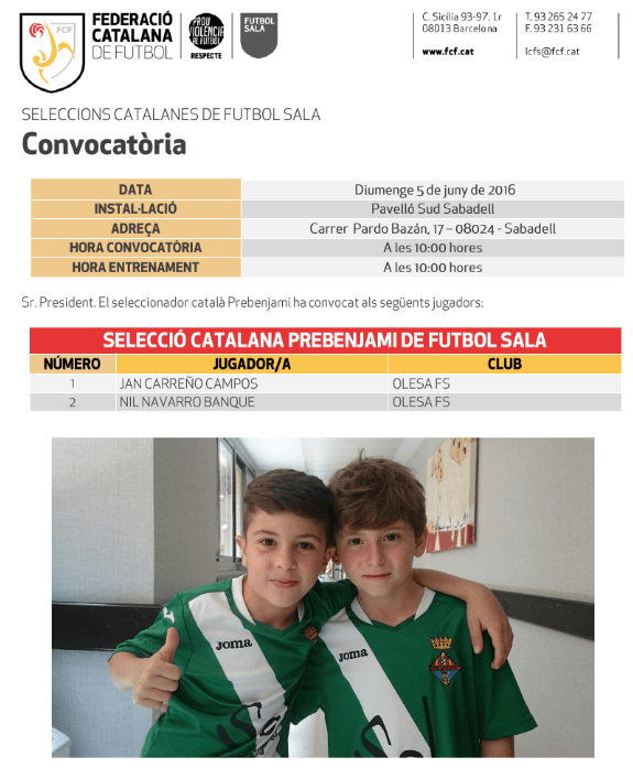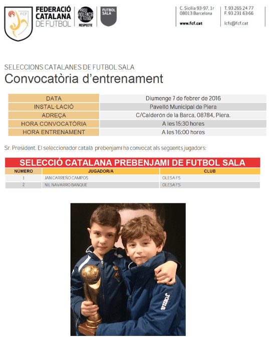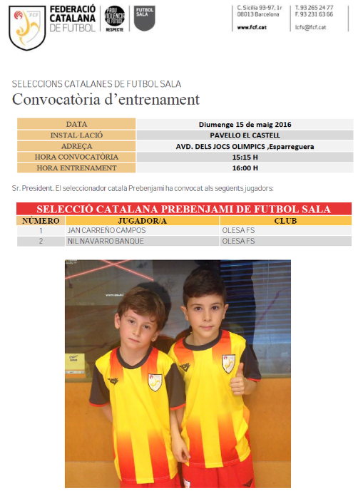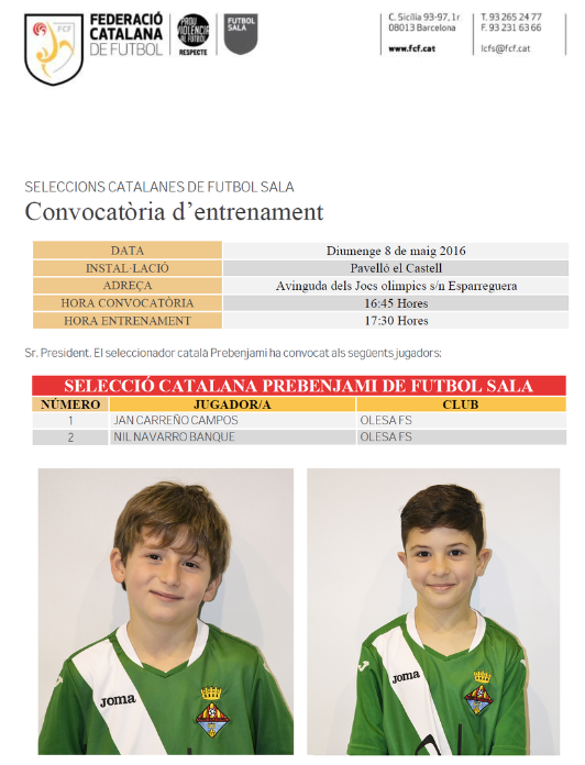 Els jugadors Jan Carreño i Nil Navarro del Prebenjamí A, han estat convocats i faran un partidet amb la Selecció Catalana de Futbol Sala de categoria Prebenjamí, aquesta és ja la sisena convocatòria.