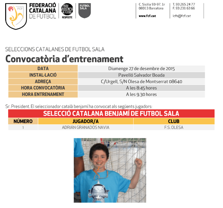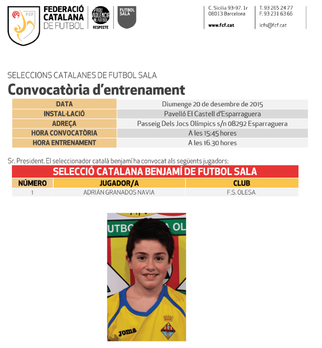 El jugador Adrià Granados del Benjamí A ha estat convocat per la Selecció Catalana de Futbol Sala de categoria Benjamí per a realitzar un entrenament preparatori per futurs campionats.