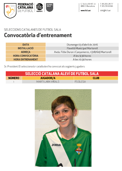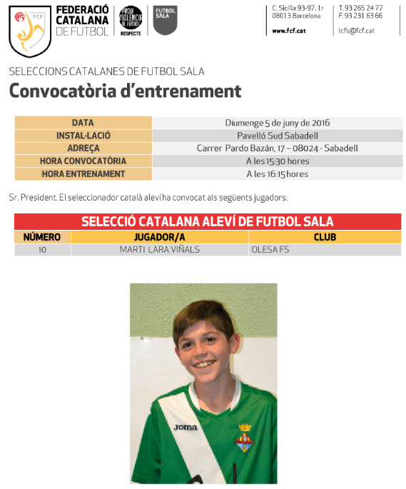 El jugador Martí Lara de l'Aleví "B" ha estat convocat per la Selecció Catalana de Futbol Sala de categoria Aleví per a realitzar un entrenament a Sabadell.