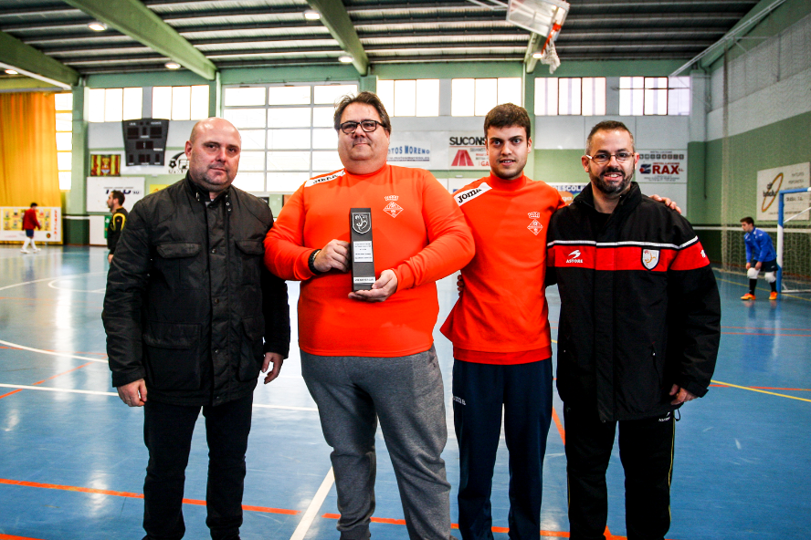 És per aquest motiu que el president de la Lliga Catalana de Futbol Sala, José Miguel Calle, acompanyat del directiu responsable de les seleccions catalanes, Ramon Marcial, ha fet entrega d’un trofeu commemoratiu al president del FS Olesa, Ricard Rosselló, acompanyat pel director tècnic del club, Enric Lobo."