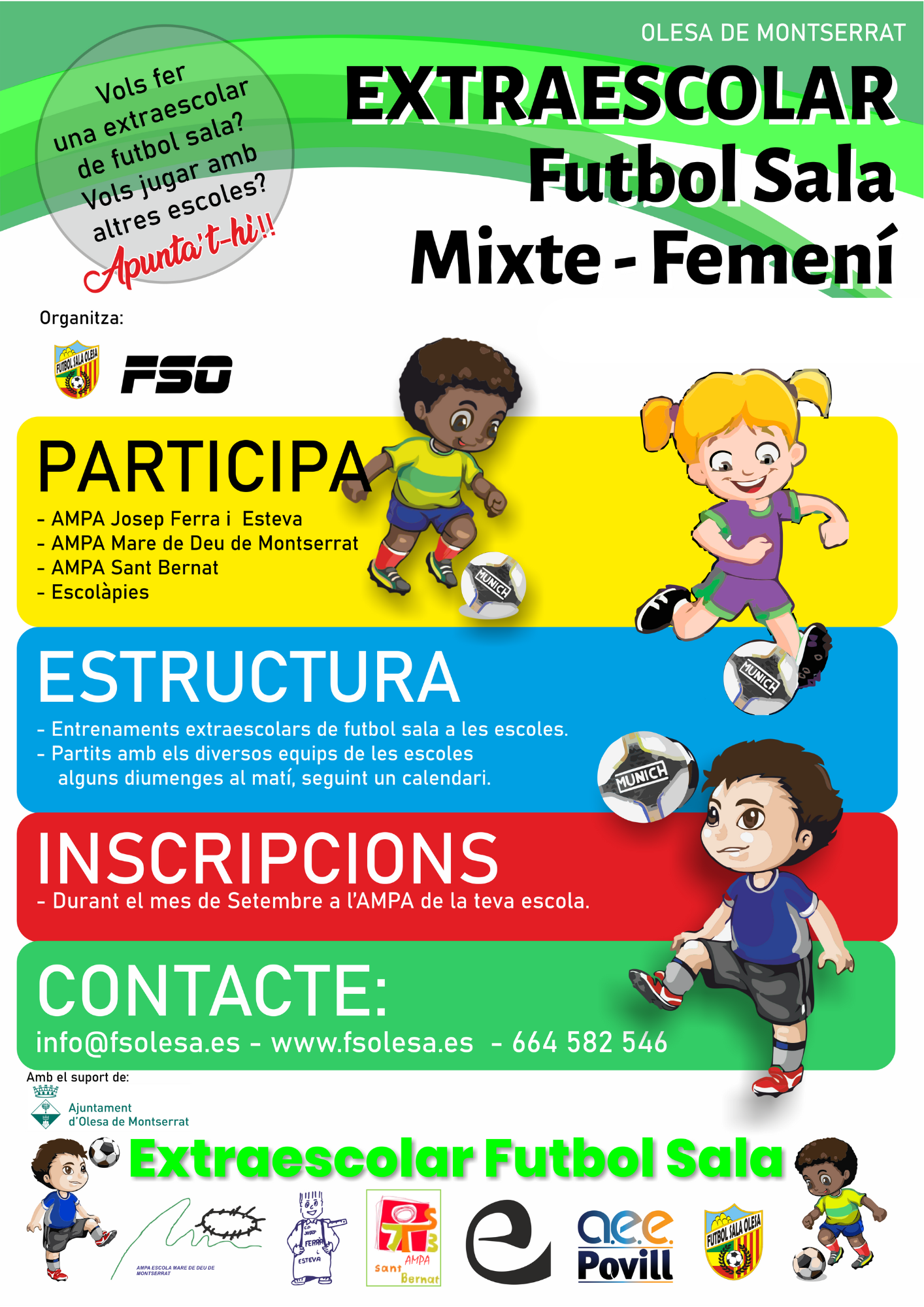 el club Futbol Sala Olesa juntament amb l’AMPA de la teva escola ofereixen l’activitat de futbol sala extraescolar a la pista poliesportiva del pati, es faran grups d’iniciació al futbol sala segons l’edat que entrenaran dos cops a la setmana amb entrenadors titulats, i una lliga amb les altres escoles del municipi que jugaran un partit cada dos diumenges al matí.