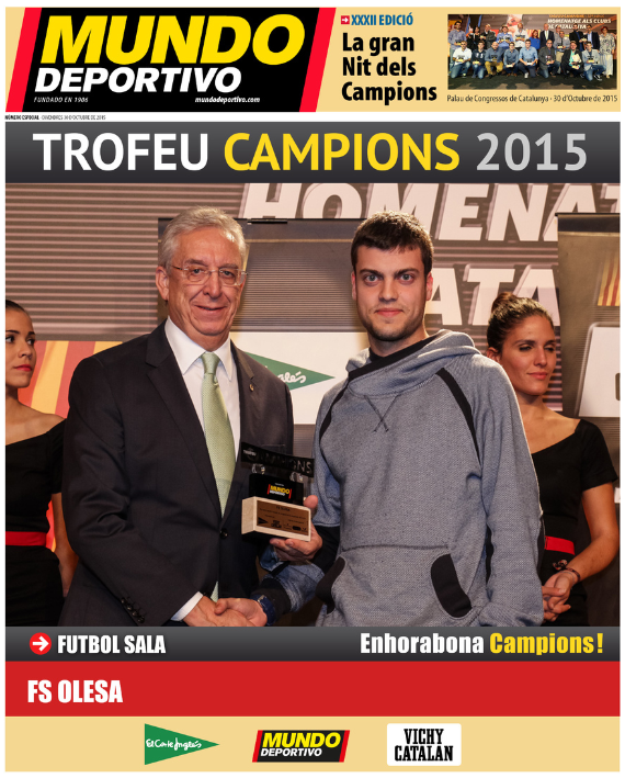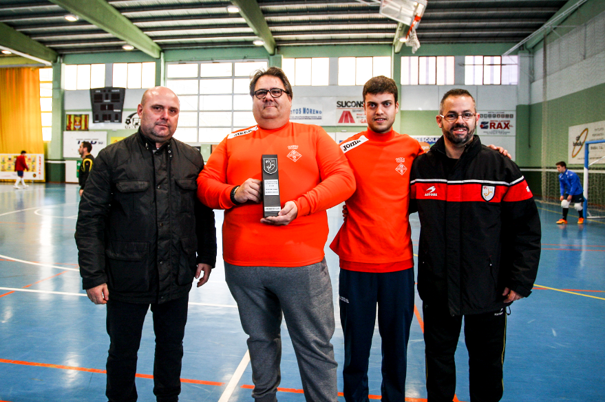 És per aquest motiu que el president de la Lliga Catalana de Futbol Sala, José Miguel Calle, acompanyat del directiu responsable de les seleccions catalanes, Ramon Marcial, ha fet entrega d’un trofeu commemoratiu al president del FS Olesa, Ricard Rosselló, acompanyat pel director tècnic del club, Enric Lobo."
