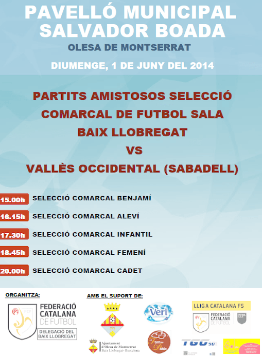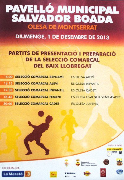 Aquest passat diumenge, 1 de desembre, es van celebrar a Olesa de Montserrat els Partits de Presentació i Preparació de la Selecció Comarcal del Baix Llobregat amb els equips de la nostra entitat, durant tota la tarda es va respirar un molt bon ambient de futbol sala i es va poder gaudir amb el grandíssim nivell dels millors jugadors de la nostra comarca. Per a la nostra entitat ha estat un orgull poder acollir aquest esdeveniment i volem felicitar als organitzadors i als seleccionadors per la bona tasca desinteressada que estan fent i també volem felicitar als protagonistes d'aquesta festa, als jugadors de la selecció, entre els quals hi ha 4 olesans. Per últim volem desitjar-vos molta sort en el Campionat Comarcal de Seleccions Base de Futbol Sala 2013-2014 que afrontareu aquest proper cap de setmana!!!