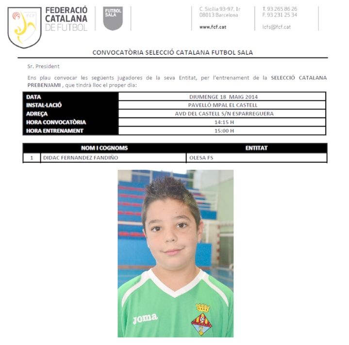 En Didac Fernandez, jugador del Prebenjamí A, ha estat convocat un altre cop amb la Selecció Catalana de Futbol Sala de categoria Prebenjamí per a realitzar un entrenament.