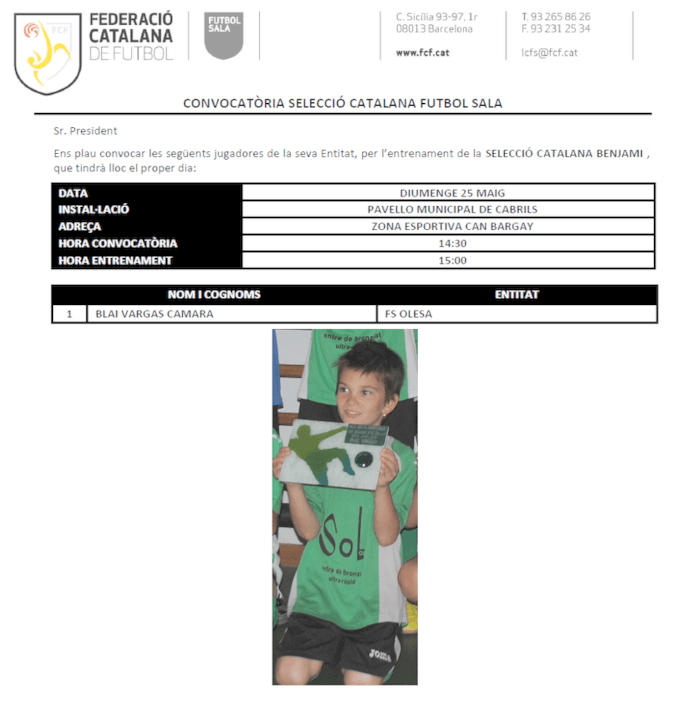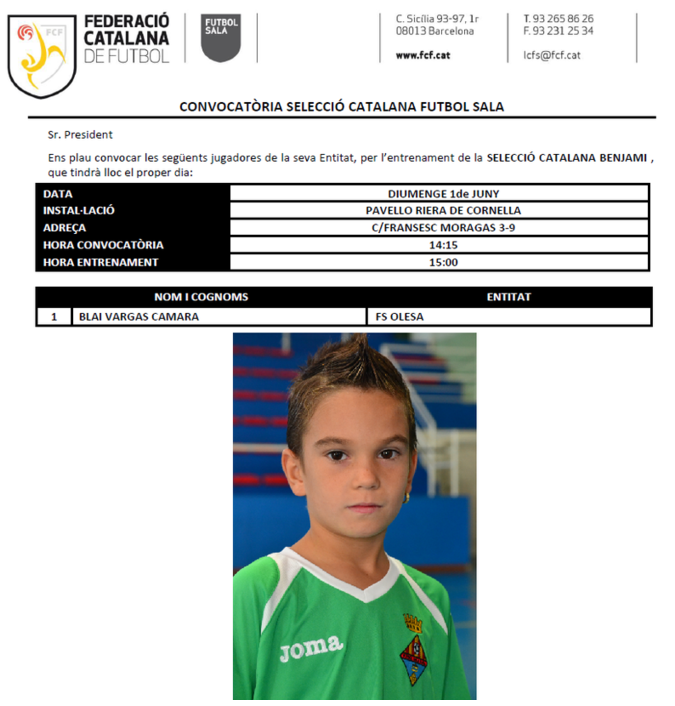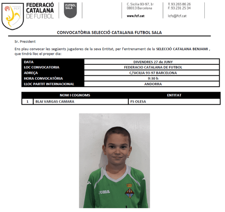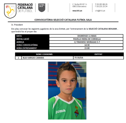 En Blai Vargas, jugador del Benjamí A, ha estat convocat entre els dotze jugadors definitius que representaran a la Selecció Catalana de Futbol Sala de categoria Benjamí en un partit amistós.