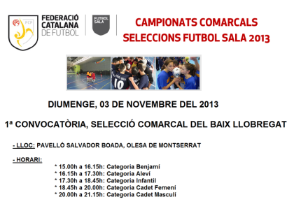 Aquest diumenge, 3 de novembre, a la tarda es faran els entrenaments de la 1ª Convocatòria de la Selecció del Baix Llobregat de Futbol Sala al Pavelló Mpal. Salvador Boada d'Olesa de Montserrat, amb l'objectiu de començar a preparar la 3ª edició del Campionat Comarcal de Seleccions Base de Futbol Sala que es celebrarà, els propers 6 i 7 de desembre, amb una representació de jugadors base de tota Catalunya.