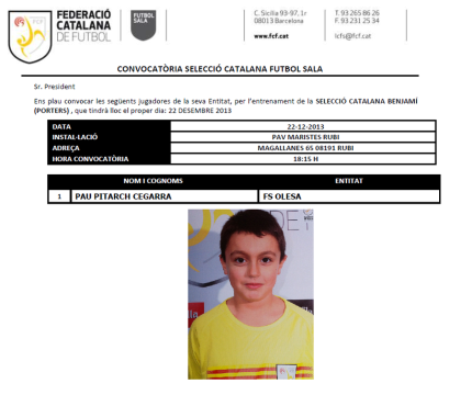 El porter Pau Pitarch del Benjamí A ha estat convocat per la Selecció Catalana de Futbol Sala de categoria Benjamí per a realitzar un entrenament preparatori per futurs campionats.