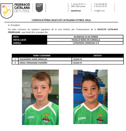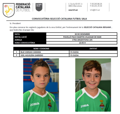 Els jugadors Joel Aguilera i Blai Vargas del Benjamí A han estat convocats per la Selecció Catalana de Futbol Sala de categoria Benjamí per a realitzar un entrenament preparatori per futurs campionats.