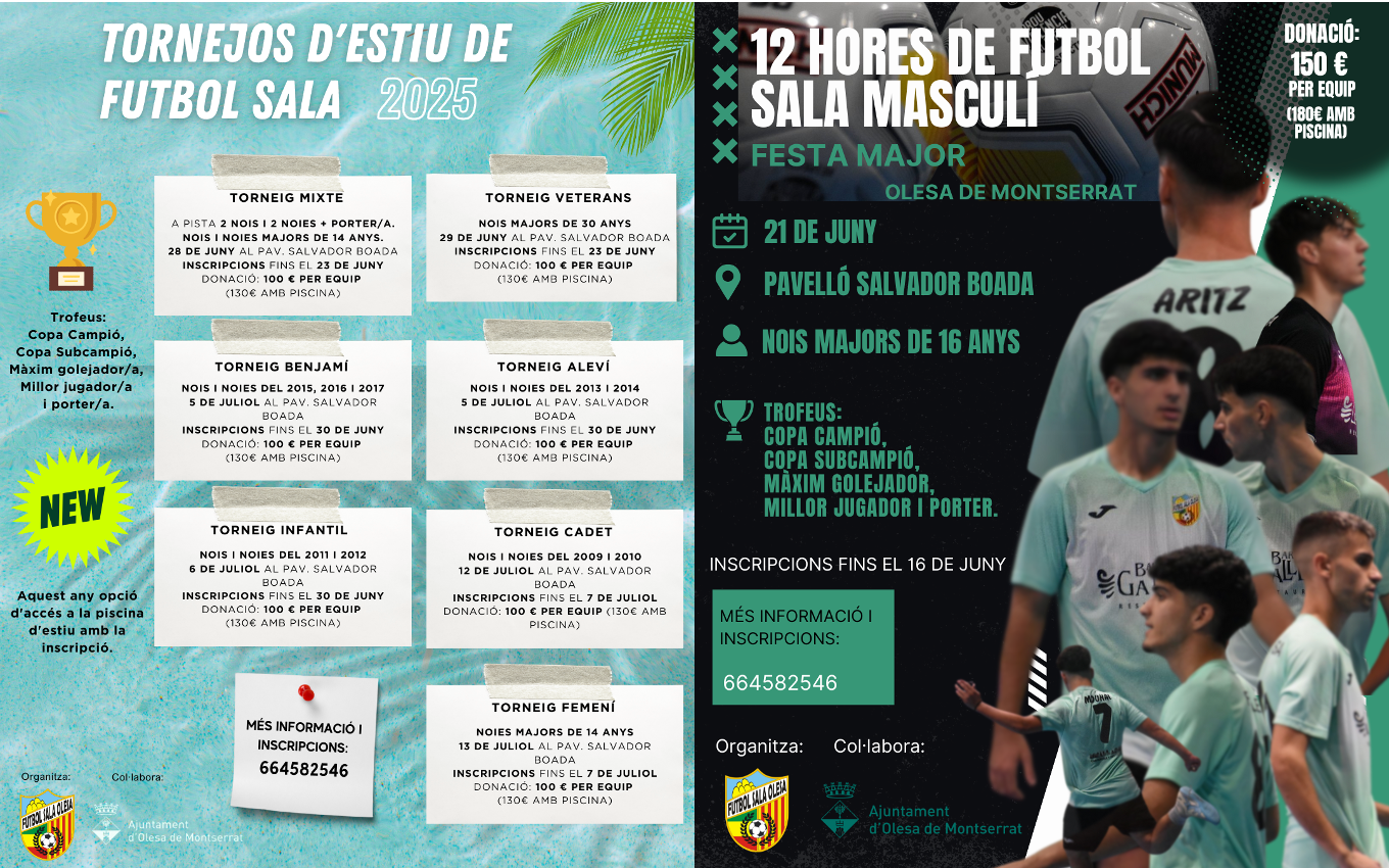 Aquest any organitzem per la festa major, el 21 de juny, les 12 hores de futbol sala masculí. I a continuació els següents caps de setmana de juny i juliol organitzem tornejos de futbol sala: mixte, veterans, benjamí, aleví, infantil, cadet, i femení. Com a novetat aquest any també pots arribar a tenir accés a la piscina d'estiu per a tot l'equip. Per participar-hi has d'omplir el formulari d'inscripció: https://forms.gle/auLdpGAhjpD1EvCz7 I abonar el donatiu: ES3700810041950001184220 Als cartells de la notícia pots trobar tota la informació. Així com a l'apartat específic de la nostra web.