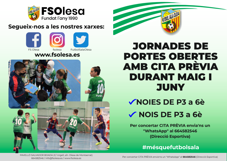 El Futbol Sala Olesa obre les seves portes a noies i nois de totes les edats, a partir dels 3 anys, que vulguin gaudir del futbol sala!