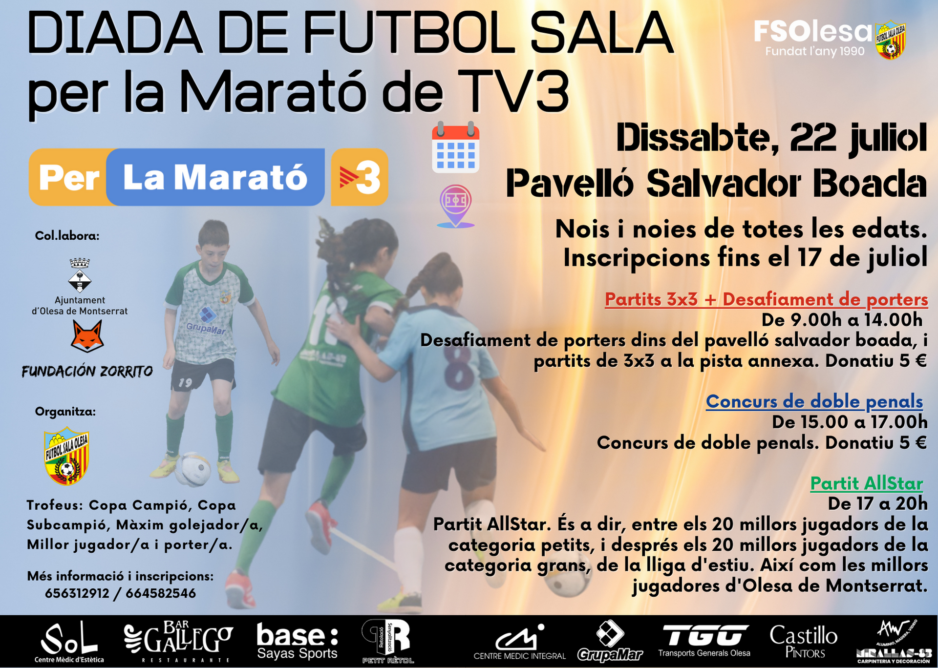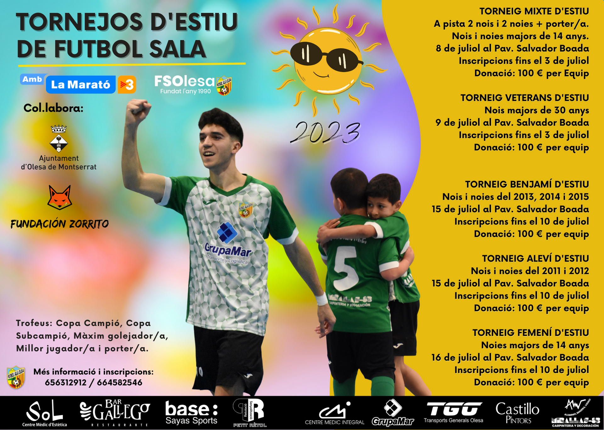 Aquest any organitzem per la festa major, el 21 de juny, les 12 hores de futbol sala masculí. I a continuació els següents caps de setmana de juny i juliol organitzem tornejos de futbol sala: mixte, veterans, benjamí, aleví, infantil, cadet, i femení. Com a novetat aquest any també pots arribar a tenir accés a la piscina d'estiu per a tot l'equip. Per participar-hi has d'omplir el formulari d'inscripció: https://forms.gle/auLdpGAhjpD1EvCz7 I abonar el donatiu: ES3700810041950001184220 Als cartells de la notícia pots trobar tota la informació. Així com a l'apartat específic de la nostra web.